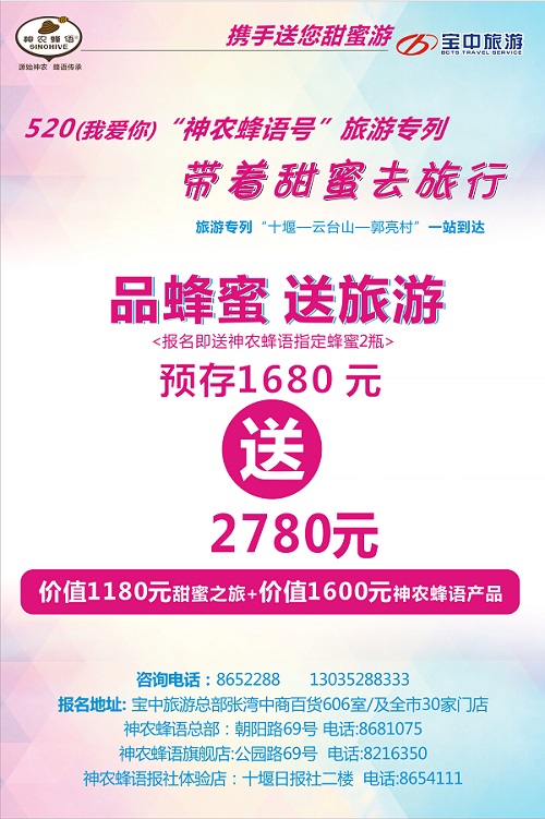 初夏時分,一個充滿甜蜜愛戀滋味的日子在這個熱情的月份里更是耀眼奪目——520,我愛你。神農蜂語特攜手十堰寶中國際旅行社開設520(我愛你)“神農蜂語號”旅游專列,品蜂蜜,送旅游,報名即送神農蜂語蜂蜜2瓶!