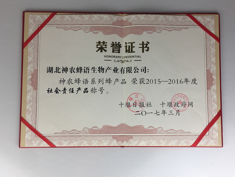 另外,在今年3·15中,神農蜂語除了榮獲“健康產業好口碑”單位之外,神農蜂語系列產品還獲得了由十堰晚報、十堰政府網聯合頒發的2015—2016年度“社會責任產品”稱號!