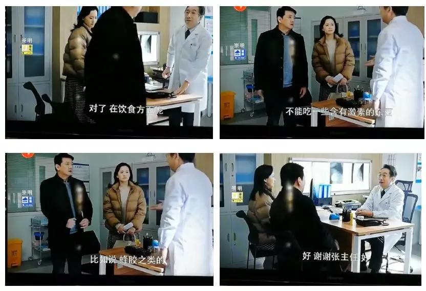 最近在東方衛視、浙江衛視熱播的,由黃磊、雷博、郭思含、朱景曦、曾玥編劇,江俊執導的電視劇《小歡喜》第34集中,有季區長愛人劉靜得了乳腺癌,醫生張主任對他們說: “對了!在飲食方面,要注意啊,不能吃含有激素的東西,比如說蜂膠之類的……”的情節,截圖如下: