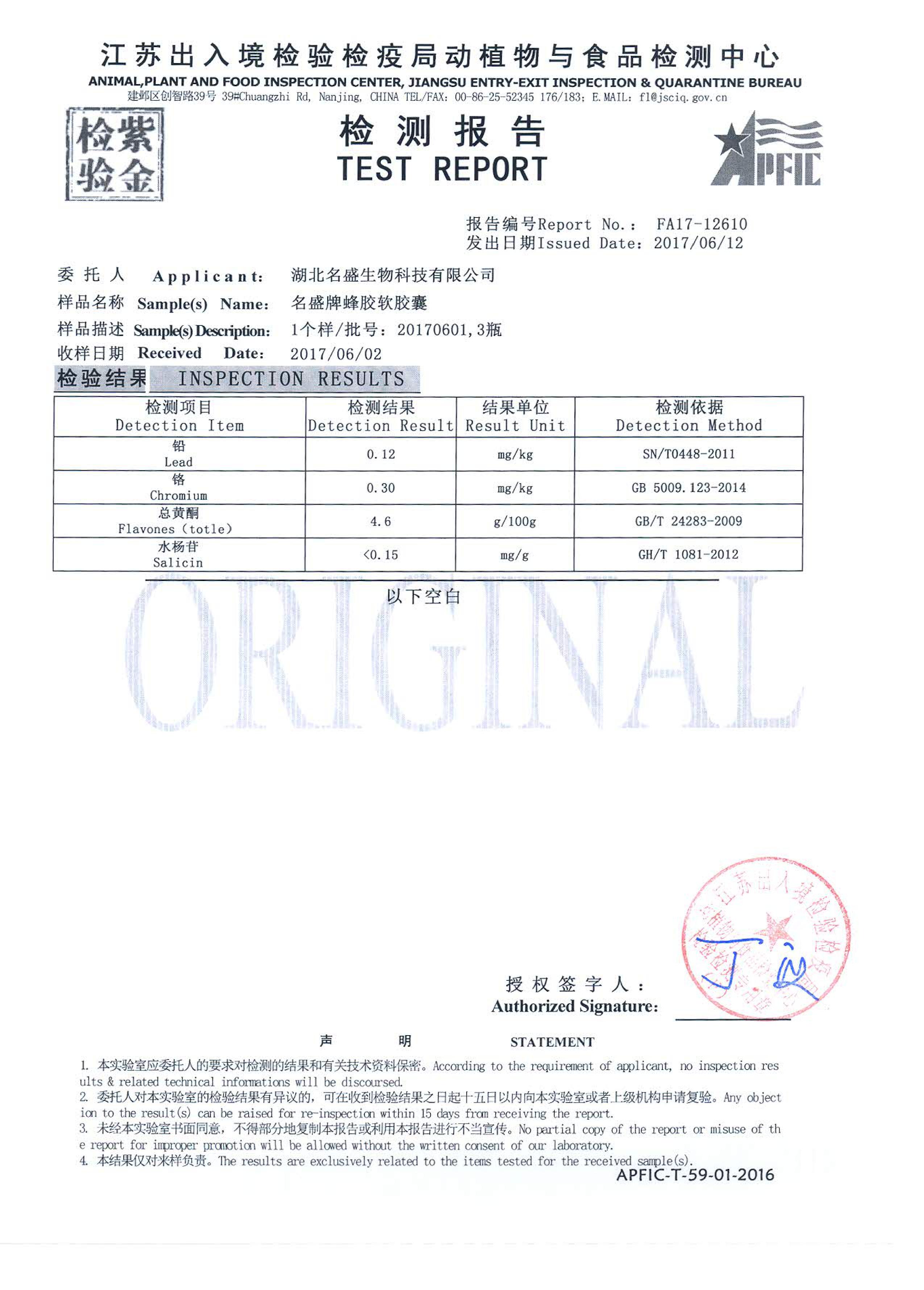 注:神農蜂語委托湖北名盛生物科技有限公司生產蜂膠軟膠囊,故報告委托人寫的是后者。