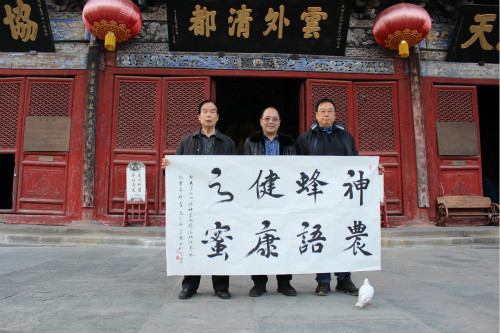 歐陽學忠先生(左一)和他的字。(神農蜂語,健康之蜜)