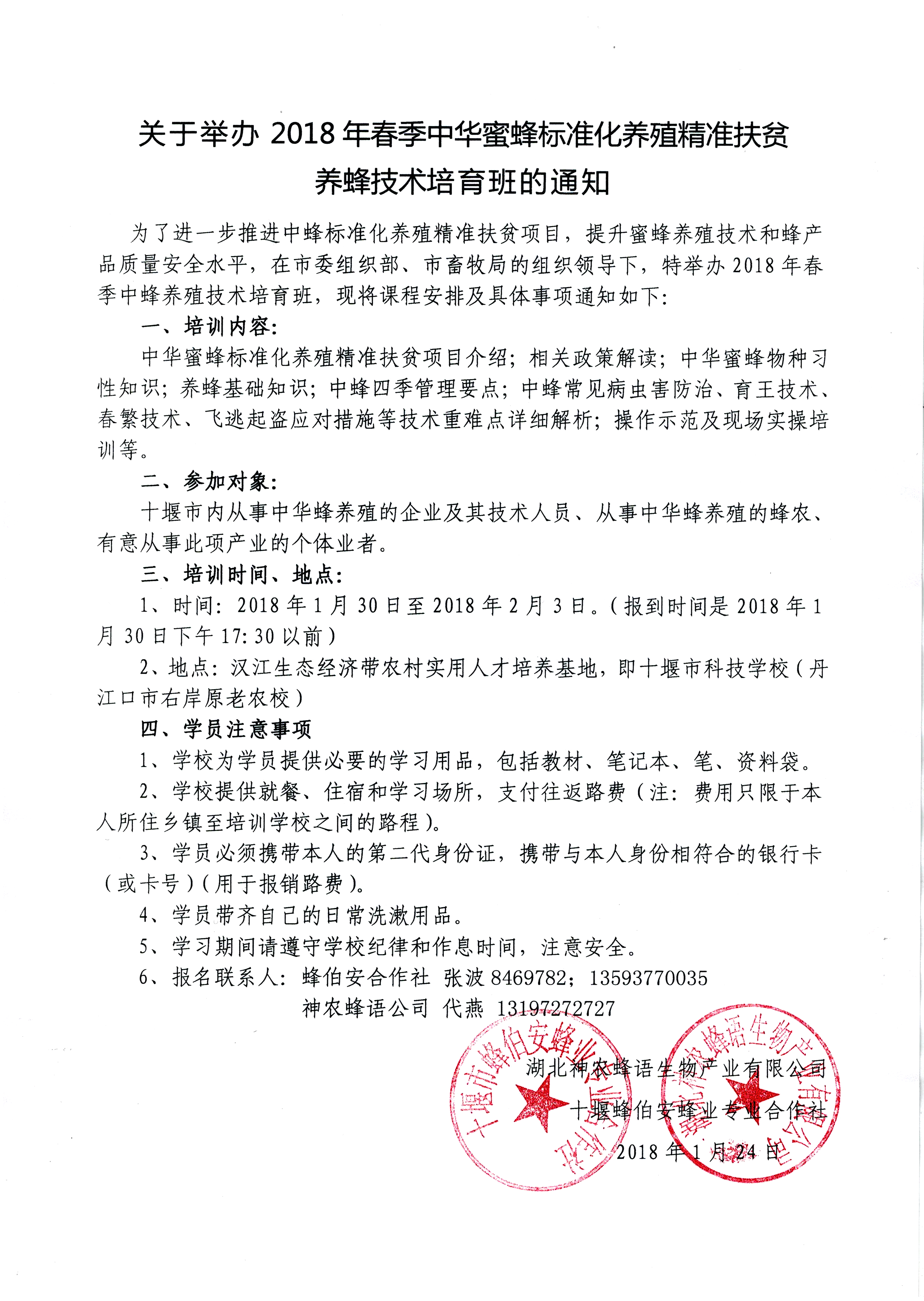 為了進一步推進中蜂標準化養殖J準扶貧項目,提升蜜蜂養殖技術和蜂產品質量安Q水平,在十堰市委組織部、市畜牧局的組織領導下,特舉辦2018年春季中蜂養殖技術培育班?,F將課程安排及具體事項通知如下: